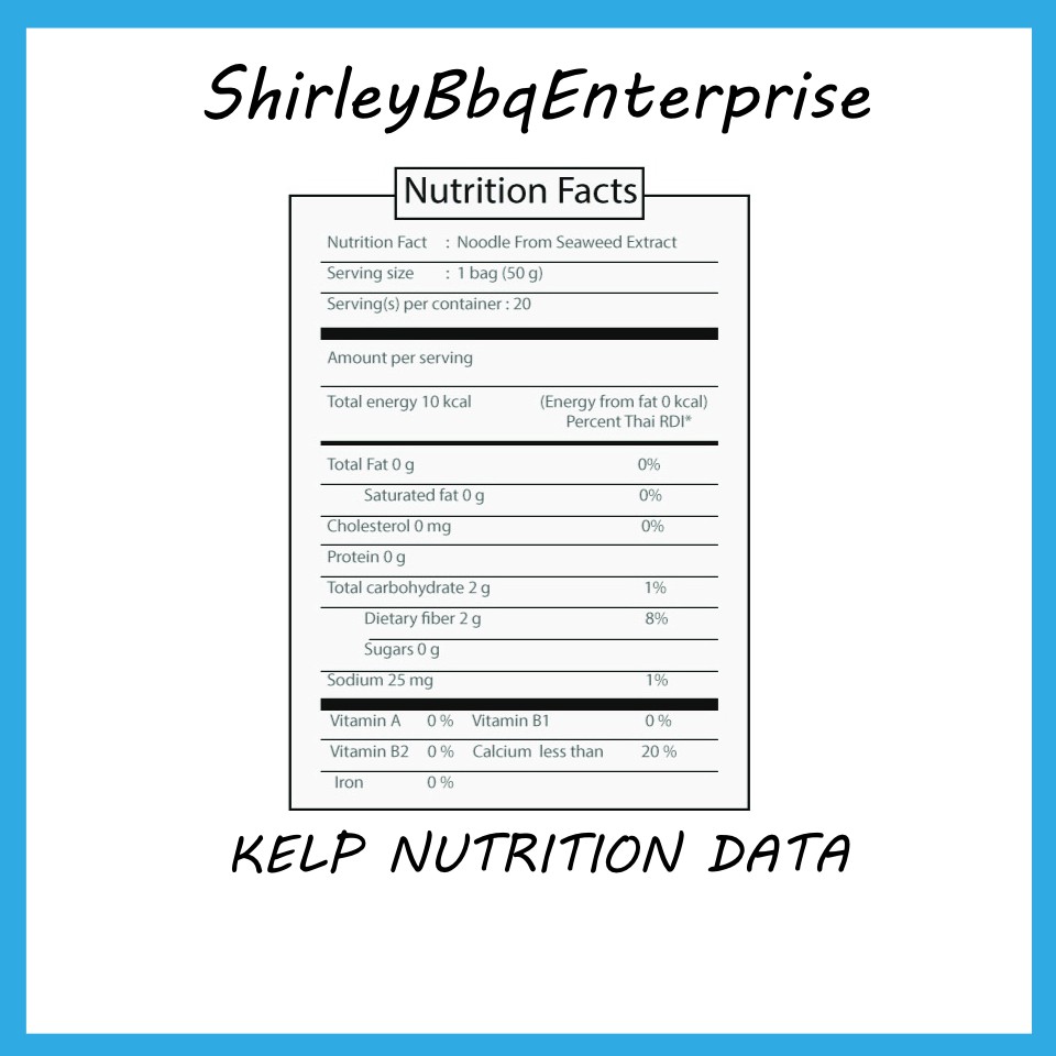 Sea Tangle Kelp Noodles - Shop Pasta & Rice at H-E-B 12 oz $4.68 ($0.39/oz) Product description Great for salad. Healthful, delicious, easy to prepare, and fun to eat! A raw food. Made with mineral-rich sea kelp. Low in carbs and calories and fat-free. Free of all allergens. Ready to eat. Neutral taste. Our Story: Kelp Noodles are a sea vegetable in the form of an easy to eat noodle. Kelp: Health Benefits, Nutrients per Serving, Preparation ... - WebMD Calcium. Folate. Magnesium. Vitamin K. Nutrients per Serving. You can buy kelp fresh, dried, or in noodle form. Serving sizes are often small and may not add significant nutrition to your diet. A ... Kelp Noodle Nutrition Facts - Calforlife Kelp Noodle Nutrition Facts 3458 Kelp Noodle พลังงานทั้งหมด 21.5 กิโลแคลอรี่ 1 of Kelp Noodle has total calories 21.5 kilocalories, protein 0.8 g., carbohydrate 4.8 g. and Fat 0.3 g. vitamins and minerals please see more information on nutrition facts sheet below. Nutrition facts created by user por25222522 Kelp Benefits, Nutrition Facts and How to Use - Dr. Axe One serving of raw kelp (about 28 grams) contains about: 12 calories 2.7 grams carbohydrates 0.5 gram protein 0.2 gram fat 0.4 gram fiber 18.5 micrograms vitamin K (23 percent DV) 50.4 micrograms folate (13 percent DV) 33.9 milligrams magnesium (8 percent DV) 47 milligrams calcium (5 percent DV) 0.8 milligram iron (4 percent DV)