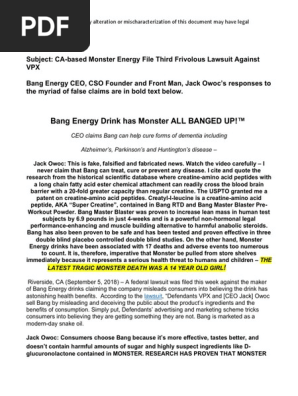 What is Super Creatine in Bang? (Detailed) - Beastly Energy Bang Super Creatine Lawsuit There was a lawsuit launched by Monster against VPX, the company that makes Bang, in which the defendants claim that Bang is only providing a water-soluble version of creatine, instead of an 'invented compound called Super Creatine'. 3. Bang Energy Drink Investigation - Class Actions Lawsuits The lawsuit says VPX advertises Bang as "nothing short of a miracle drink that delivers benefits and cures that have evaded scientists for decades." Among the claims, the lawsuit says, is that it can "help cure Alzheimer's Disease, Parkinson's Disease, Huntington's Disease, and other forms of dementia ." VPX denies this. 'BANG' Energy Drink Manufacturer Claims Monster 'Shamelessly ... - Yahoo! monster targeted bang in the central district of california for marketing the drink as "not your stereotypical high-sugar, life-sucking soda masquerading as an energy drink," and claiming that one... Judge Says Bang Owner 'Fails' to Meet ... - Beverage-Digest A VPX attorney added that in June Monster was denied a preliminary injunction in its 2018 California lawsuit accusing VPX of false advertising related to Bang's use of "creatine" and "super creatine." Monster also claimed in its failed request for an injunction that VPX had intentionally interfered with shelving-space contracts with ...