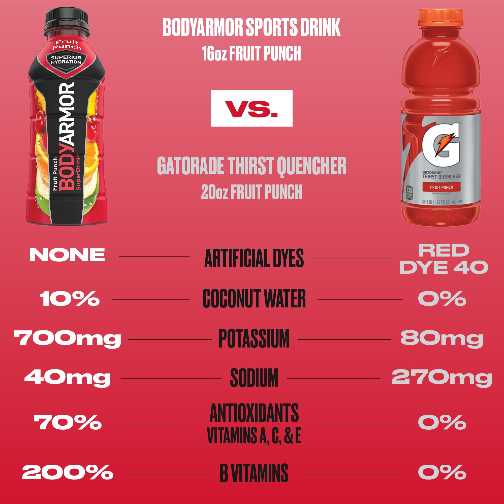 Amazon.com : BODYARMOR LYTE Sports Drink Low-Calorie Sports Beverage ... BODYARMOR LYTE Sports Drink Low-Calorie Sports Beverage, Berry Punch, Natural Flavors With Vitamins, Potassium-Packed Electrolytes, No Preservatives, Perfect For Athletes, 16 Fl Oz (Pack of 12) Visit the BODYARMOR Store 28,721 ratings | 92 answered questions Amazon's Choice in Energy Drinks by BODYARMOR Price: $14.59 ($0.08 / Fl Oz) Home | BODYARMOR Sports Drink | Superior Hydration BODYARMOR SPORTS DRINK Potassium-packed electrolytes ANTIOXIDANTS No artificial sweeteners, flavors, or dyes Learn More BODYARMOR LYTE SPORTS DRINK No artificial sweeteners, flavors, or dyes No sugar added Low Calorie Learn More BODYARMOR EDGE 100mg Caffeine 1,000mg Electrolytes Learn More BODYARMOR SPORT WATER ALKALINE pH 9+ ELECTROLYTES BODYARMOR Sport Drink, 33.8 Fl Oz Bottle - Walmart.com Nutrition facts. Refer to the product label for full dietary information, which may be available as an alternative product image. 0.08 Servings Per Container. Serving Size 12 oz. Amount per serving. ... BODYARMOR SportWater 1L is the hydration choice for your active lifestyle. With an alkaline pH 9+ and proprietary electrolyte formula ... BodyArmor vs. Gatorade - Which Sports Drink Is Best? Comparing the nutrition, electrolytes, and sugar levels of both drinks. You may know for a fact that most sports drinks are loaded with sugar. Bodyarmor and Gatorade are no exceptions! However, Bodyarmor has 18g of sugar per 8oz serving while Gatorade has 36g. The line of products in Bodyarmor Lyte contains only 2grams of sugar per bottle.
