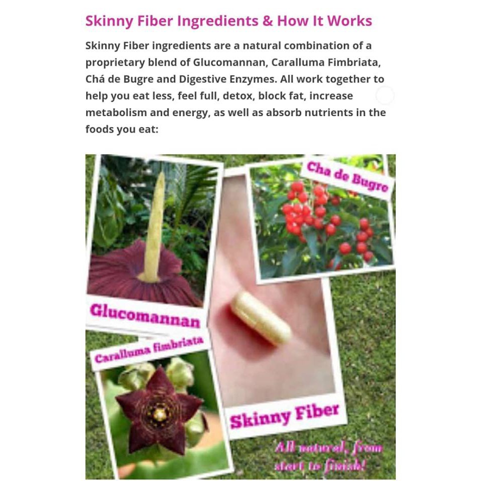 Skinny Fiber SKINNY FIBER IS AWESOME!!! It's not a Diet! It is a 100% All Natural Supplement that makes you feel fuller so you don't eat as much! But it does a lot more than just that! If you think you have tried everything and you are tired of all of the rip-offs! Please try this ! It will be the last thing you will ever need to help you reach your goals! If you don't like it, then just return it for ...