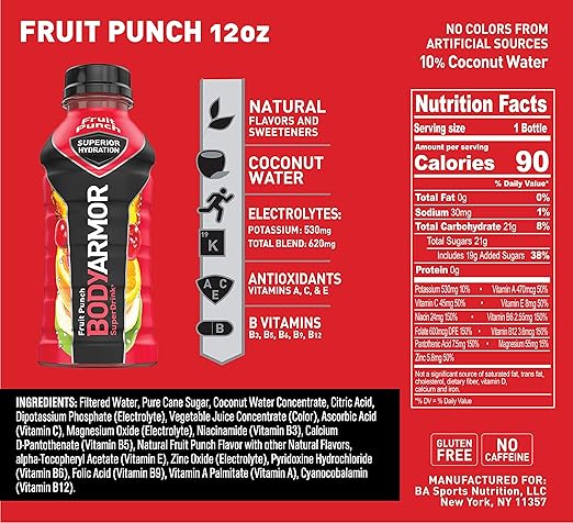 Body Armor Fruit Punch Super Drink 12 oz Bottles - H-E-B $7.00 ($0.08/oz) Icon details Product description BODYARMOR is the premium, better-for-you sports drink providing Superior Hydration for todayu001as athlete. Made with natural flavors & sweeteners, it contains potassium-packed electrolytes, Vitamins B3, B5, B6, B9, & B12 and antioxidants A, C, & E. Preparation instructions