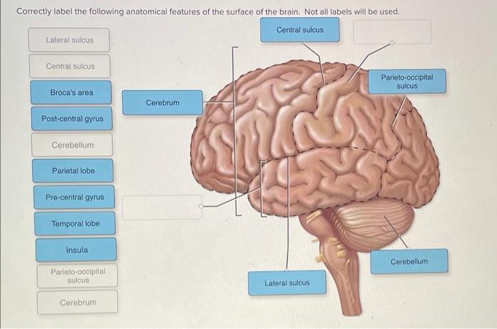 Solved 4 Correctly label the following anatomical features - Chegg Anatomy and Physiology questions and answers; 4 Correctly label the following anatomical features of the surface of the brain. Cerebellum 4 points Lateral sulcus eBook Print References Central sulcus Gyri Brainstem Cerebrum Temporal lobe Spinal cord ; Question: 4 Correctly label the following anatomical features of the surface of the brain ...
