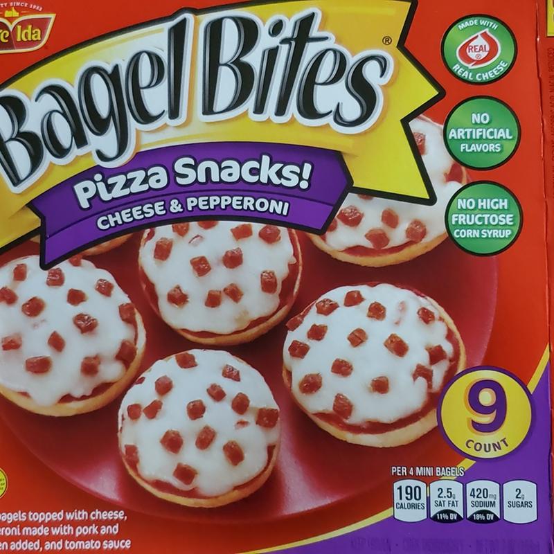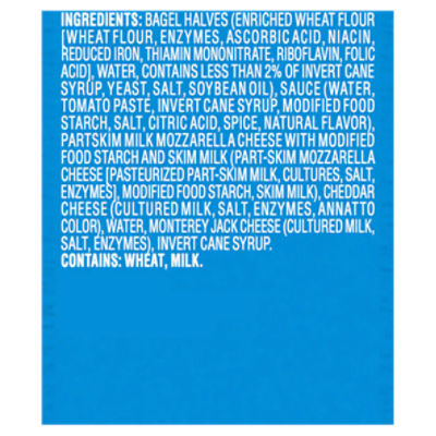 Frozen Snacks & Appetizers from Bagel Bites A delicious bite-sized snack that you can eat wherever, whenever and always hits the spot. CHECK OUT OUR SNACKS CALL THE SHOTS ON SNACK TIME. Enjoy Bagel Bites your way. Have 15 minutes? Pop them in the oven and watch them bake to perfection. Hungry now? The microwave's the way to go. Just open the box. Slide in the tray. Push start. And enjoy. Bagel Bites Three Cheese - Shop Meals & Sides at H-E-B Ingredients Bagel Halves (Enriched Flour [Wheat Flour, Enzyme, Ascorbic Acid, Niacin, Reduced Iron, Thiamine Mononitrate, Riboflavin, Folic Acid], Water, Salt, Invert Cane Syrup, Yeast, Soybean Oil), Topping (Cheese Blend [ (Cheese [Mozzarella Cheese (Cultured Milk, Salt, Enzymes), Modified Food Starch, Nonfat Milk, Whey Protein Concentrate]), … 12ct Mini Frozen Bagel Dogs | Bagel Bites Calories: 2,000 2,500; Total Fat: Less than: 65g: 80g: Sat Fat: Less than: 20g: 25g: Cholestrol: Less than: 300mg: 300mg: Sodium: Less than: 2,400mg: 2,400mg: Total carbohydrate: 300g: 375g: Dietary Fiber: 25g: 30g