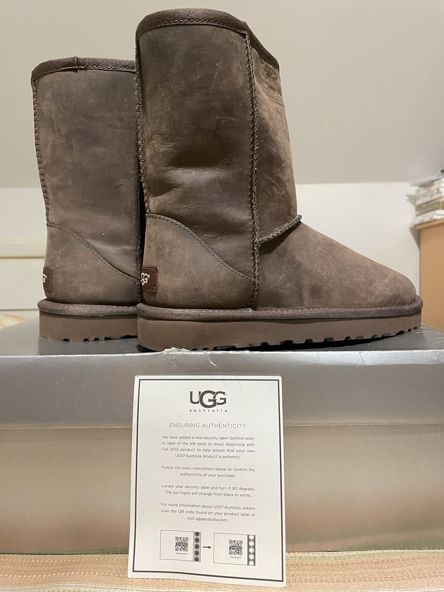 How to Spot Fake Ugg Boots: 9 Steps (with Pictures) - wikiHow Look at the security labels. Check the foil strip on the label behind the shoe size and the materials label on the left boot. If there isn't a sewn-in-label, there should be a security sticker on the sole of the left shoe. Turn your boot over to see the holographic UGG label with a sun symbol.